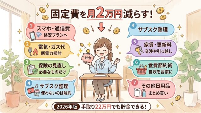 【2026年版】新社会人・一人暮らしの固定費を月2万円減らす7つの見直し|手取り22万円でも貯金できる仕組み