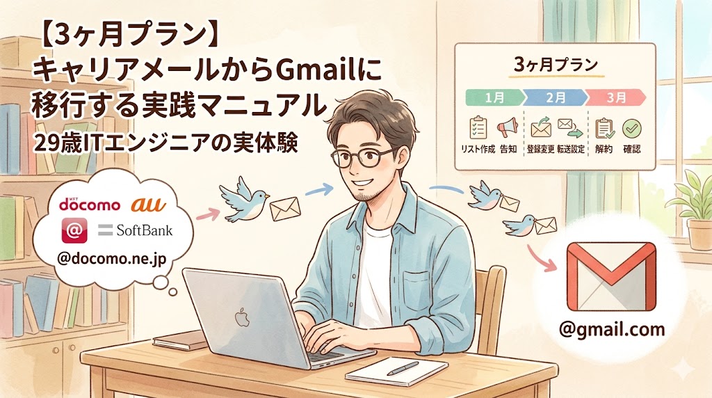 「格安SIMに乗り換えたいけど、キャリアメール(@docomo.ne.jp/@ezweb.ne.jp/@softbank.ne.jp)で登録したサービスが多すぎて、全部Gmailに変えるのが怖い」——これ、私自身が一番ハマったポイントです。
