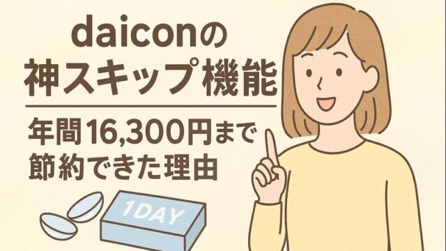 コンタクトレンズ あなたのコンタクト代、払いすぎてませんか? 2025年12月11日 wayuunmy@gmail.com 豊かな暮らしラボ 定額制コンタクトレンズ「daicon」の神機能で年間16,300円に節約できた理由 結論:コンタクト代を節約したいなら「daicon」は圧倒的にお得 私はこれ …