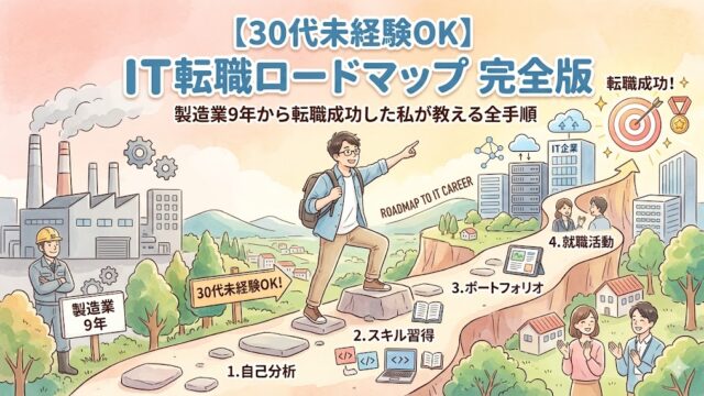 転職 【30代未経験OK】IT転職ロードマップ完全版|製造業9年から転職成功した私が教える全手順 2026年4月4日 れおなるど・ゆう 「30代で未経験からIT業界に転職なんて、本当にできるの?」 私もかつて、まったく同じ不安を抱えていました。食品メーカーで9年間働き …